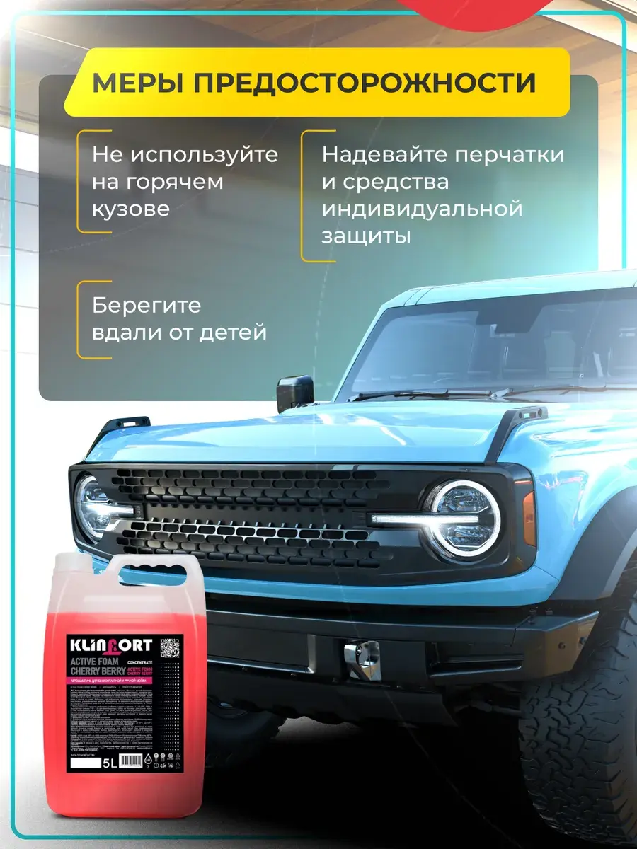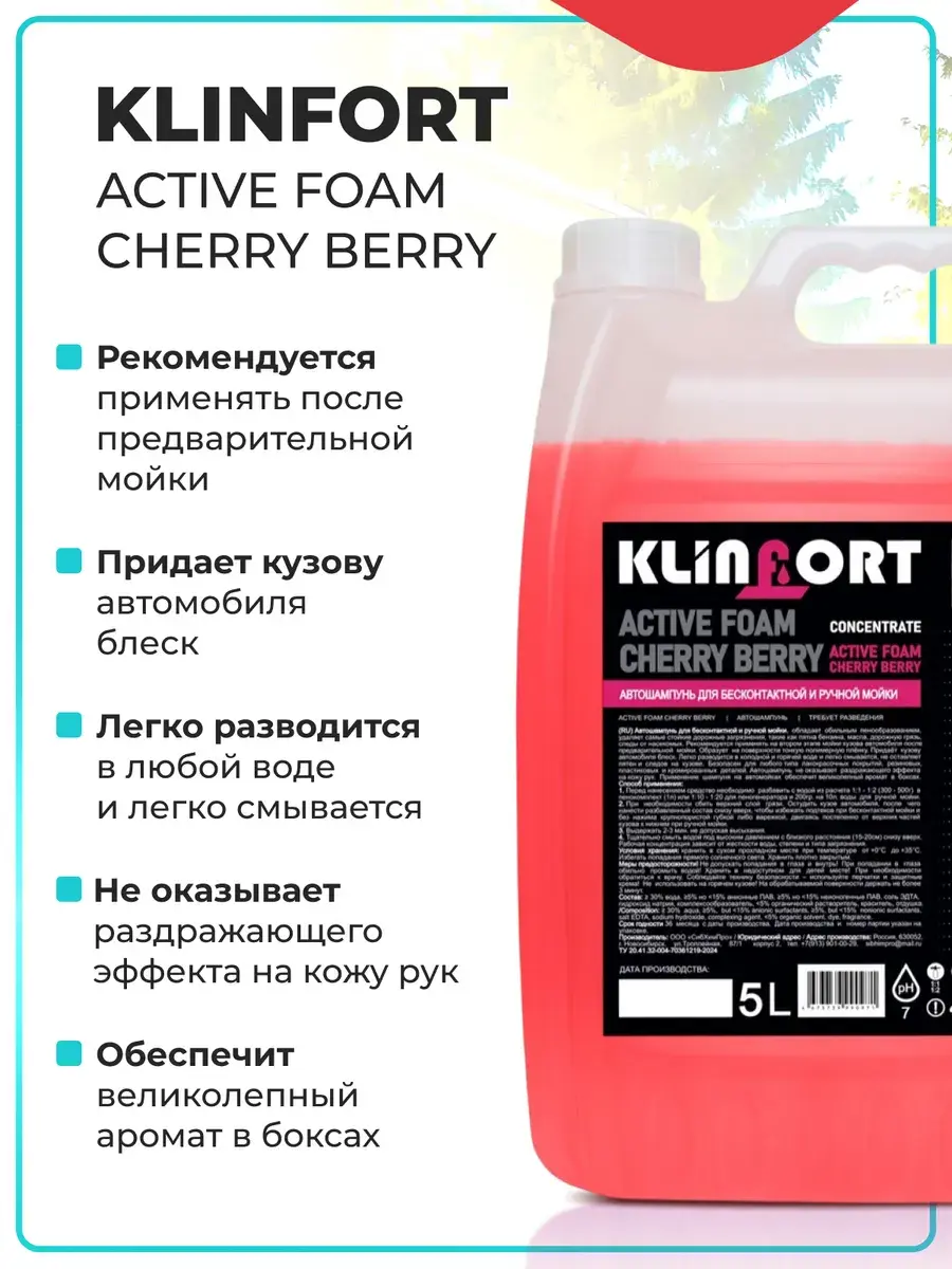 Автошампунь KLINFORT - прекрасно очищающее средство для бесконтактной и ручной мойки. Качественная автохимия подходит для мойки высокого давления - пеногенератора с распылителем - пенообразователем, так и для ручной мойки. Обработка пеной не портит лакокрасочное покрытие и хромированные автомобильные детали. Концентрат с густой и плотной пенкой равномерно покрывает поверхность автомобиля, справляется даже со стойкими загрязнениями. Моющее средство с активной формулой эффективно удаляет дорожную пыль, следы от насекомых, масло и белый налет, быстро смывается водой без разводов, дарит покрытиям приятный блеск. Автокосметику с уровнем от pH 11.5 и выше используют с водой любой жесткости, применяют в любое время года: летний и зимний, осенний и весенний период. Профессиональный автотовар заменяет мытье в автомойке подходит для очистки любого типа автотранспорта: легкового или грузового. Концентрированный очиститель с эффективной для удаления загрязнений моющей автопеной и приятным ароматом - надежный помощник автомобилиста. Универсальное чистящее средство для ухода за машиной - отличный знак внимания для автолюбителя - мужчины на любой праздник: Новый год, 23 Февраля (День защитника Отечества) или День отца. В коллекции бренда представлены автошампуни в больших пластиковых канистрах объемом 5 литров, 20 литров, чтобы вы могли выбрать идеально подходящую для ваших задач упаковку. Запаянное горлышко - защита от проливания и гарантия качества от производителя! Не используйте автокосметику на горячем кузове грузовика или легковушки и работайте в защитных перчатках. Храните автохимию объемом или 5л, 20л в местах, где ее не найдут дети. Производство Россия. У нас есть акции и распродажи, вы можете купить наши товары в подарок со скидкой!
