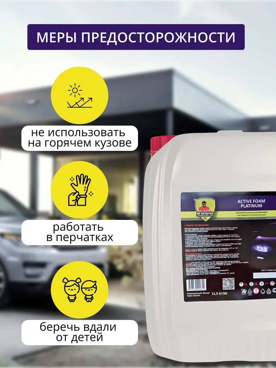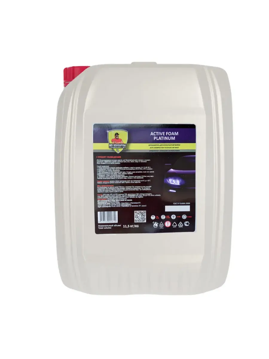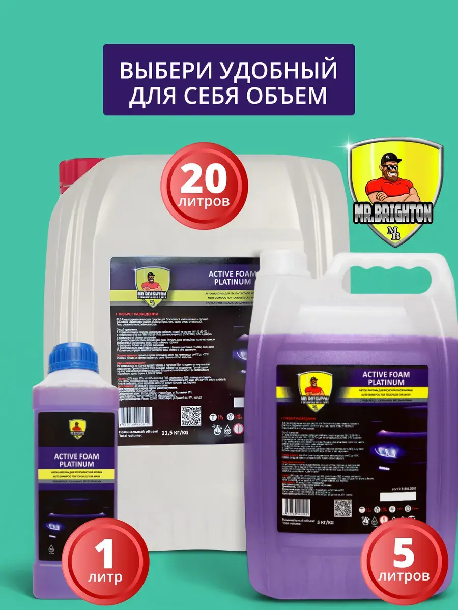 Автошампунь из коллекции бренда Mr.Brighton - прекрасно очищающее средство для бесконтактной мойки. Качественная автохимия подходит для мойки высокого давления - пеногенератора с распылителем - пенообразователем. Обработка пеной не портит лакокрасочное покрытие и хромированные автомобильные детали. Концентрат с густой и плотной пенкой равномерно покрывает поверхность автомобиля, справляется даже со стойкими загрязнениями. Моющее средство с активной формулой эффективно удаляет дорожную пыль, следы от насекомых, масло и белый налет, быстро смывается водой без разводов, дарит покрытиям приятный блеск. Автокосметику с уровнем от pH 11.5 и выше используют с водой любой жесткости, применяют в любое время года: летний и зимний, осенний и весенний период. Профессиональный автотовар заменяет мытье в автомойке подходит для очистки любого типа автотранспорта: легкового или грузового. Концентрированный очиститель с эффективной для удаления загрязнений моющей автопеной и приятным ароматом - надежный помощник автомобилиста. Универсальное чистящее средство для ухода за машиной - отличный знак внимания для автолюбителя - мужчины на любой праздник: Новый год, 23 Февраля (День защитника Отечества) или День отца. В коллекции бренда представлены автошампуни в больших пластиковых канистрах объемом 20 литров, 5 литров и в бутылках объемом 1 литр, чтобы вы могли выбрать идеально подходящую для ваших задач упаковку. Запаянное горлышко - защита от проливания и гарантия качества от производителя! Не используйте автокосметику на горячем кузове грузовика или легковушки и работайте в защитных перчатках. Храните автохимию объемом 1л или 5л, 20л в местах, где ее не найдут дети. Производство Россия. У нас есть акции и распродажи, вы можете купить наши товары в подарок со скидкой!