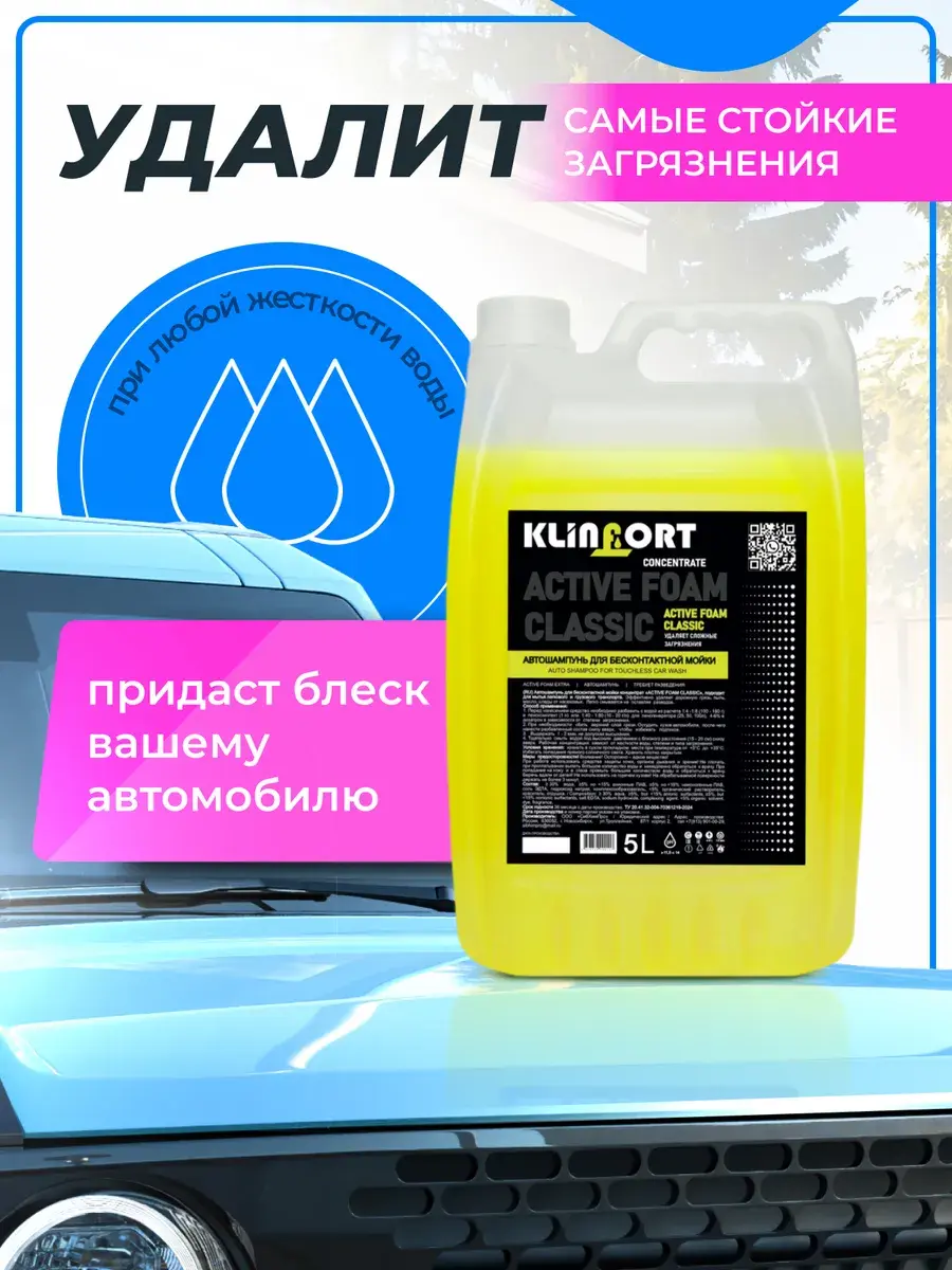 Автошампунь KLINFORT - прекрасно очищающее средство для бесконтактной мойки. Качественная автохимия подходит для мойки высокого давления - пеногенератора с распылителем - пенообразователем. Обработка пеной не портит лакокрасочное покрытие и хромированные автомобильные детали. Концентрат с густой и плотной пенкой равномерно покрывает поверхность автомобиля, справляется даже со стойкими загрязнениями. Моющее средство с активной формулой эффективно удаляет дорожную пыль, следы от насекомых, масло и белый налет, быстро смывается водой без разводов, дарит покрытиям приятный блеск. Автокосметику с уровнем от pH 11.5 и выше используют с водой любой жесткости, применяют в любое время года: летний и зимний, осенний и весенний период. Профессиональный автотовар заменяет мытье в автомойке подходит для очистки любого типа автотранспорта: легкового или грузового. Концентрированный очиститель с эффективной для удаления загрязнений моющей автопеной и приятным ароматом - надежный помощник автомобилиста. Универсальное чистящее средство для ухода за машиной - отличный знак внимания для автолюбителя - мужчины на любой праздник: Новый год, 23 Февраля (День защитника Отечества) или День отца. В коллекции бренда представлены автошампуни в больших пластиковых канистрах объемом 5 литров, 20 литров, чтобы вы могли выбрать идеально подходящую для ваших задач упаковку. Запаянное горлышко - защита от проливания и гарантия качества от производителя! Не используйте автокосметику на горячем кузове грузовика или легковушки и работайте в защитных перчатках. Храните автохимию объемом или 5л, 20л в местах, где ее не найдут дети. Производство Россия. У нас есть акции и распродажи, вы можете купить наши товары в подарок со скидкой!