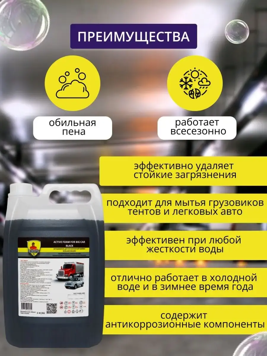 Обработка пеной не портит лакокрасочное покрытие и хромированные автомобильные детали. Концентрат с густой и плотной пенкой равномерно покрывает поверхность автомобиля, справляется даже со стойкими загрязнениями. Моющее средство с активной формулой эффективно удаляет дорожную пыль, следы от насекомых, масло и белый налет, быстро смывается водой без разводов, дарит покрытиям приятный блеск. Автокосметику с уровнем pH 14 с антикоррозийными компонентами используют с водой любой жесткости, применяют в любое время года: летний и зимний, осенний и весенний период. Профессиональный автотовар заменяет мытье в автомойке подходит для очистки любого типа автотранспорта: легкового или грузового. Концентрированный очиститель с эффективной для удаления загрязнений моющей автопеной - надежный помощник автомобилиста. Универсальное чистящее средство для ухода за машиной - отличный знак внимания для автолюбителя - мужчины на любой праздник: Новый год, 23 Февраля (День защитника Отечества) или День отца. В коллекции бренда представлены автошампуни в больших пластиковых канистрах объемом 5 литров и в бутылках объемом 1 литр, чтобы вы могли выбрать идеально подходящую для ваших задач упаковку. Запаянное горлышко - защита от проливания и гарантия качества от производителя! Не используйте автокосметику на горячем кузове грузовика или легковушки и работайте в защитных перчатках. Храните автохимию объемом 1л или 5л в местах, где ее не найдут дети. Производство Россия. У нас есть акции и распродажи, вы можете купить наши товары в подарок со скидкой!