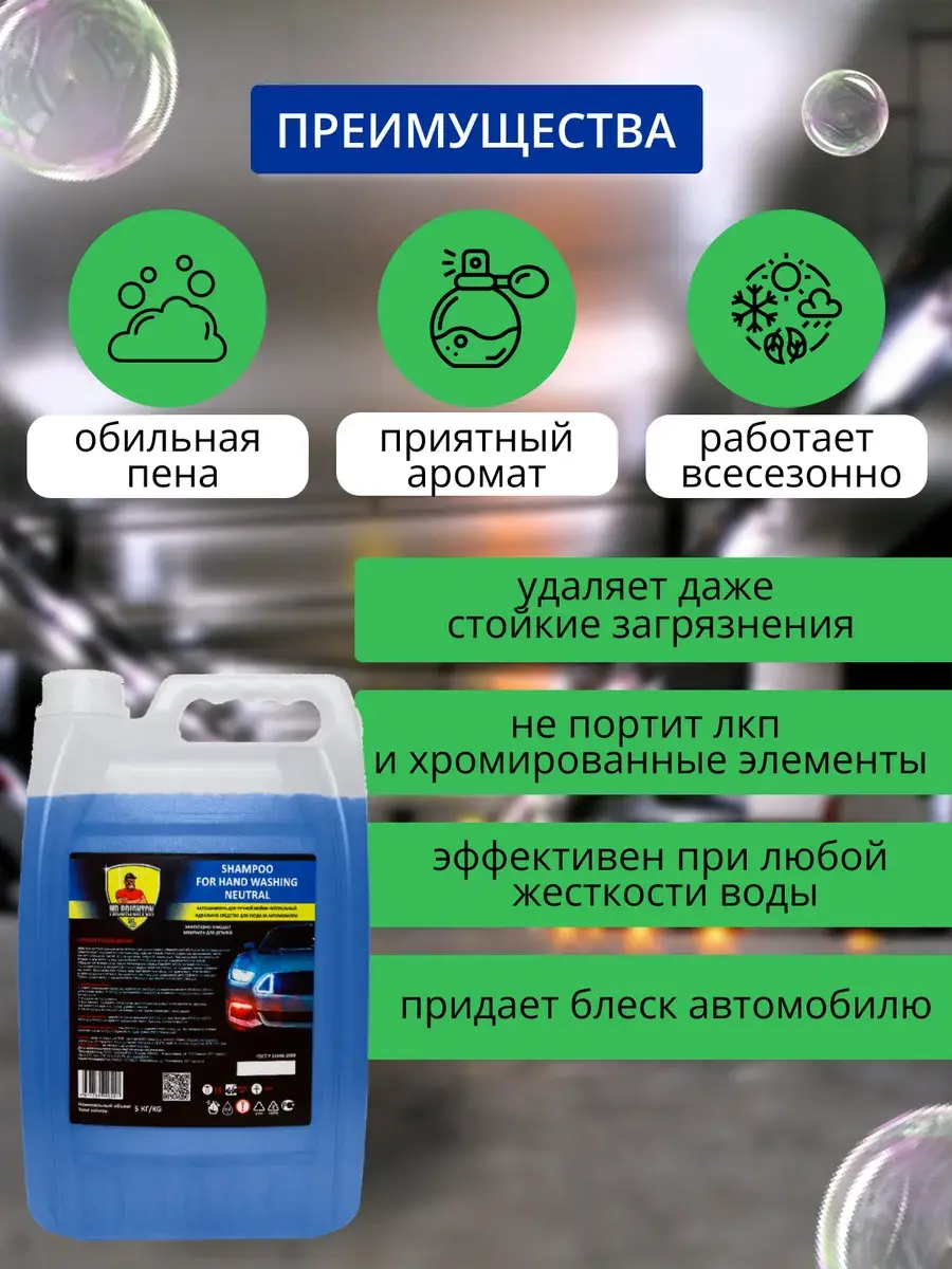 Автошампунь нейтральный для ручной мойки —предназначен для тщательной и безопасной очистки автомобиля, удаляет стойкие загрязнения и не повреждает ЛКП или хромированные элементы.
