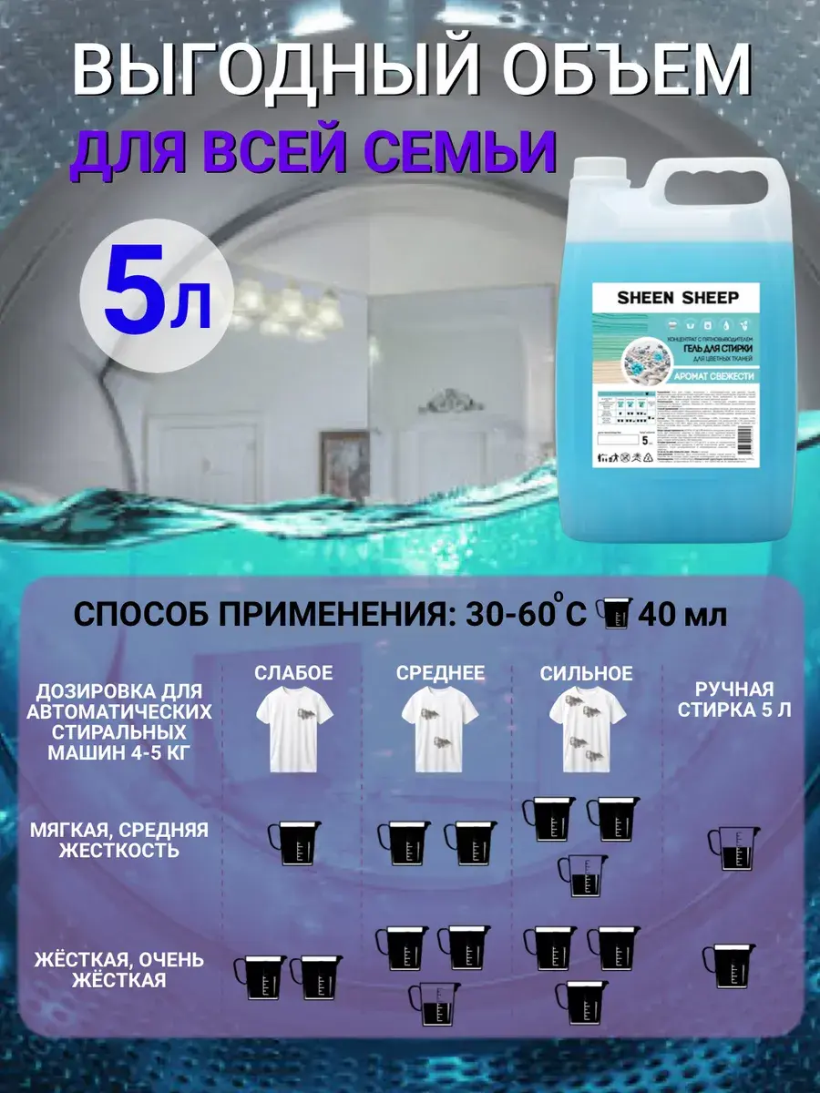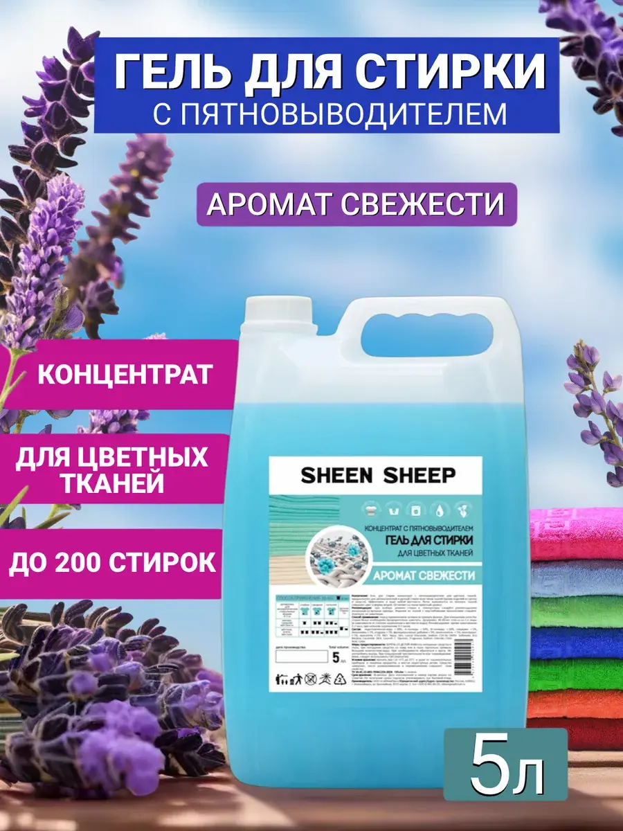 Гель для стирки концентрат с пятновыводителем аромат свежести автомат 5 литров Sheen Sheep, это универсальное гипоаллергенное средство, которое не только эффективно удаляет пятна, но и бережно относится к вашему белью. Жидкий стиральный порошок не имеет в составе агрессивных и вредных компонентов. Он предназначенный для стирки и замачивания белых, черных и цветных тканей - хлопчатобумажных, льняных, синтетических, из смешанных волокон (кроме шерсти и шёлка). Жидкий стиральный порошок можно использовать как для машинной - автомат, так и ручной стирки в воде любой жесткости. Одним из ключевых преимуществ данного геля для стирки это его способность сохранять первоначальный цвет и текстуру ваших вещей, за счет использования специально разработанных компонентов, которые не только удаляют пятна, благодаря пятновыводителю, но и защищают ткани от износа и потери яркости. Кроме того, средство полностью выполаскивается, что делает его экологичным, гипоаллергенным, безопасным даже для стирки детского белья (0+), и людей с чувствительной кожей. Для достижения наилучших результатов, просто добавьте необходимое количество геля для стирки в отсек для жидкого порошка вашей стиральной машины. Дозировка зависит от степени загрязнения белья и жесткости воды. Для удаления трудных пятен нанести концентрат непосредственно на загрязнение перед стиркой, выдержать не менее 10 минут, при необходимости применить механическое воздействие. Рекомендуемая температура стирки от 40 до 60 градусов. Концентрированная формула позволяет расходовать меньше средства, что является более выгодным вариантом для вашей семьи, а отсутствие хлора и фосфатов, делает его безопасным для вашего здоровья и окружающей среды. Приятный аромат не только освежает ваши вещи, но и создаёт атмосферу уюта и комфорта в вашем доме. Выбирая этот гель для стирки, объем канистра 5 литров вы получаете высокое качество и заботу о ваших вещах, наслаждаясь безупречной чистотой и свежестью надолго!