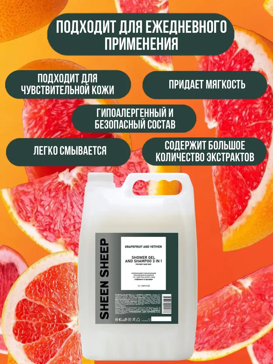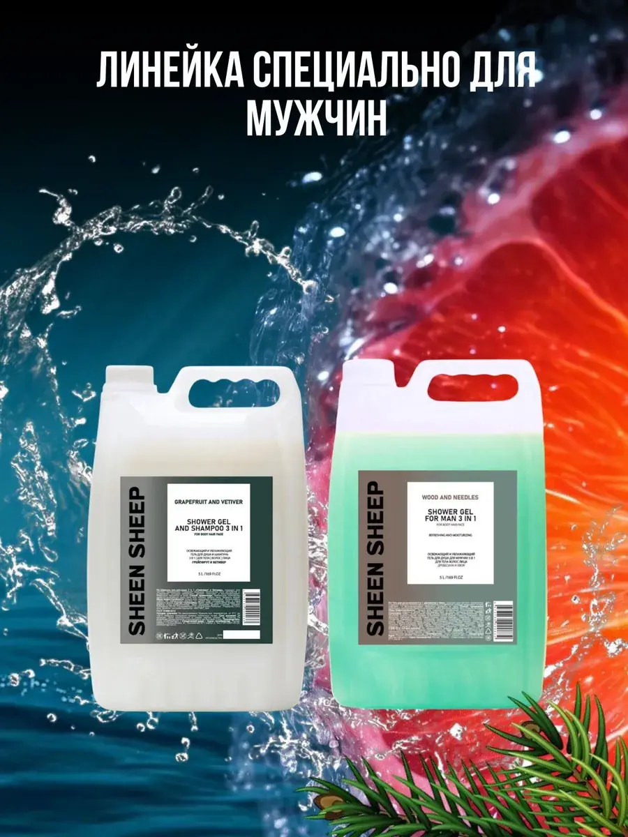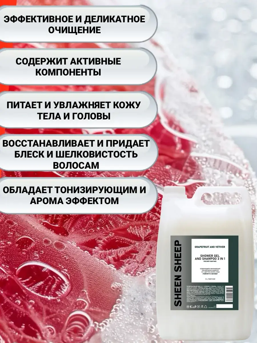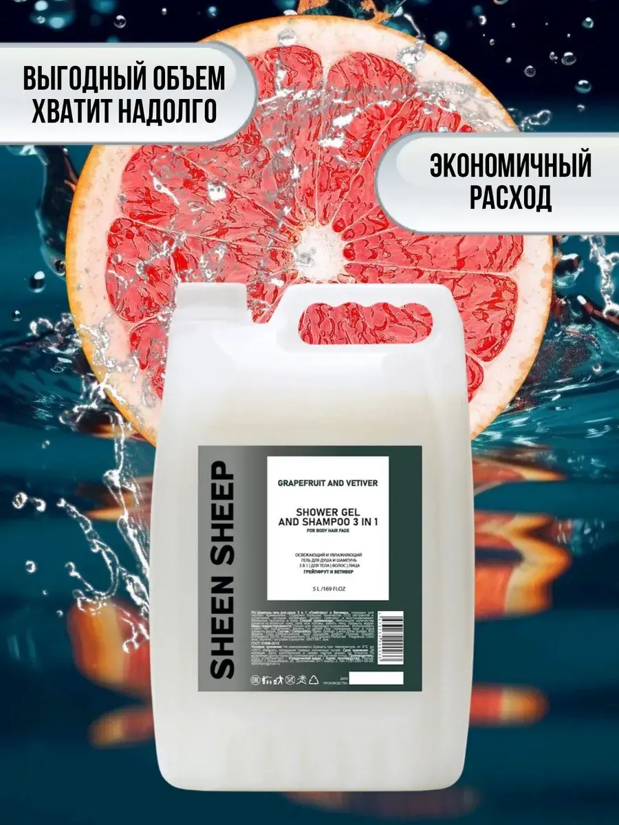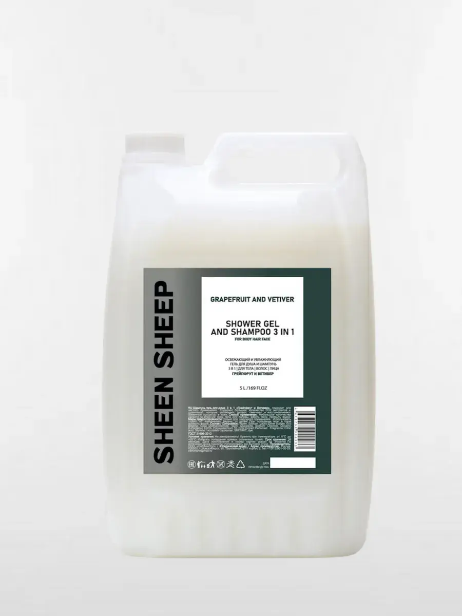Мужской парфюмированный гель для душа и шампунь 3в1 Грейпфрут и Ветивер из коллекции бренда SHEEN SHEEP 5л - гипоаллергенное увлажняющее средство для очищения и ухода за кожей тела, лица, головы. Уникальный состав гель шампуня бережно очищают кожу, не пересушивая ее, не вызывает перхоти. Активные компоненты делают волосы более гладкими послушными, снимают раздражение, дарят невероятную мягкость и гладкость. Этот роскошный мужской аромат, который может подойти и для женщин, расслабляет, приносит удовольствия от принятия ванны и душа после тяжелого рабочего дня или тренировки. Мягкая формула обладает тонизирующим действием, легко распределяется по всему телу, образуя обильную пену, которая нежно очищает, удаляя загрязнения. Гель для душа шампунь для волос 3в1 можно применять для всех типов кожи. Консистенция его очень густая, что уменьшает расход. СПОСОБ ПРИМЕНЕНИЯ: нанести средство на ладонь или мочалку, предварительно смочив водой, и распределите массирующими движениями по волосам или телу до образования пены, затем смойте. Идеально для ежедневного мытья в душевой кабине или ванной, наслаждайтесь его приятным парфюмированным ароматом на основе качественной отдушки. Большая канистра объемом 5 литров, это отличный вариант, который поможет сэкономить ваш бюджет и время, позволяет использовать в гостиницах, отелях, спортзалах, в бане, парикмахерских.