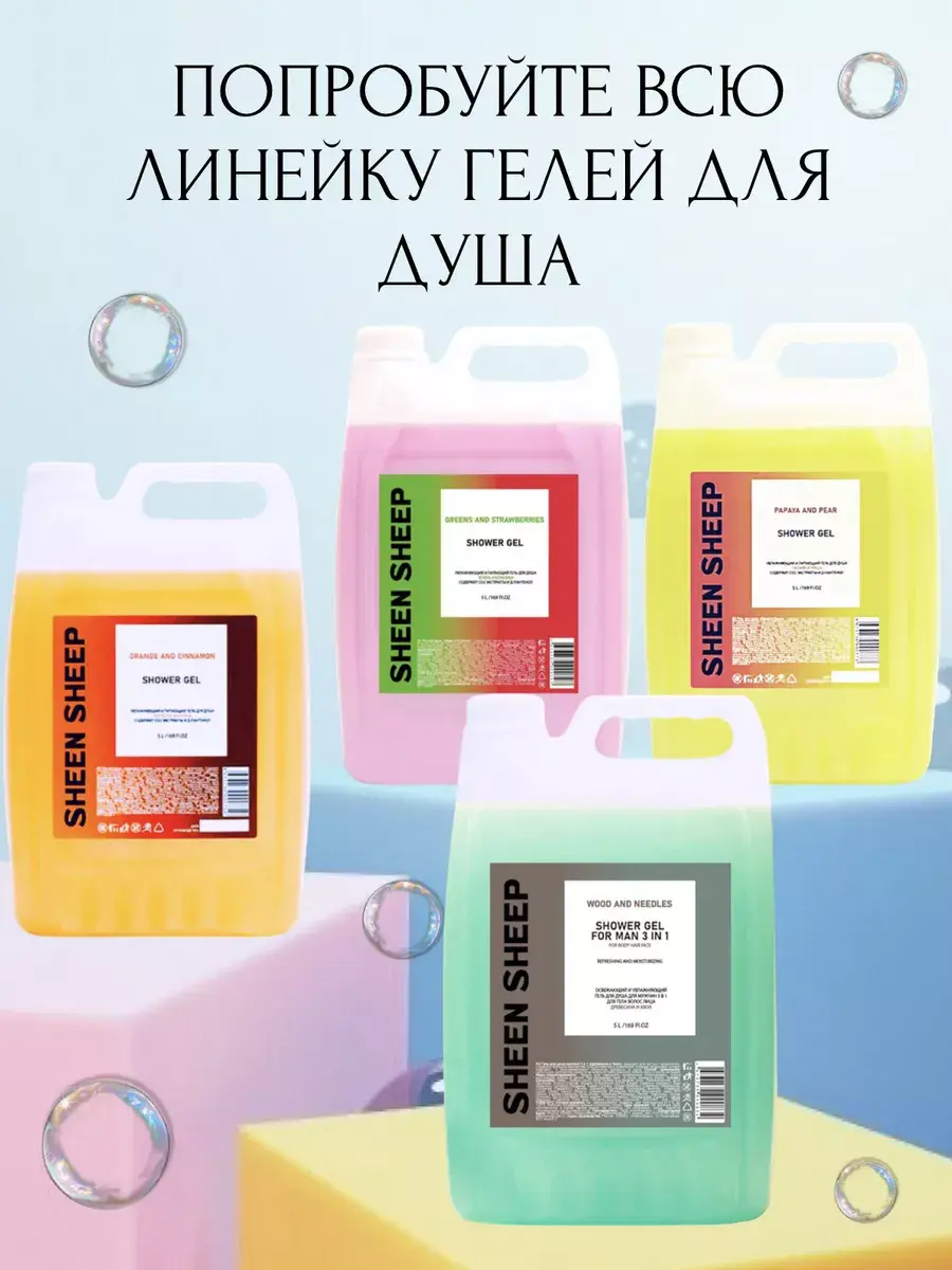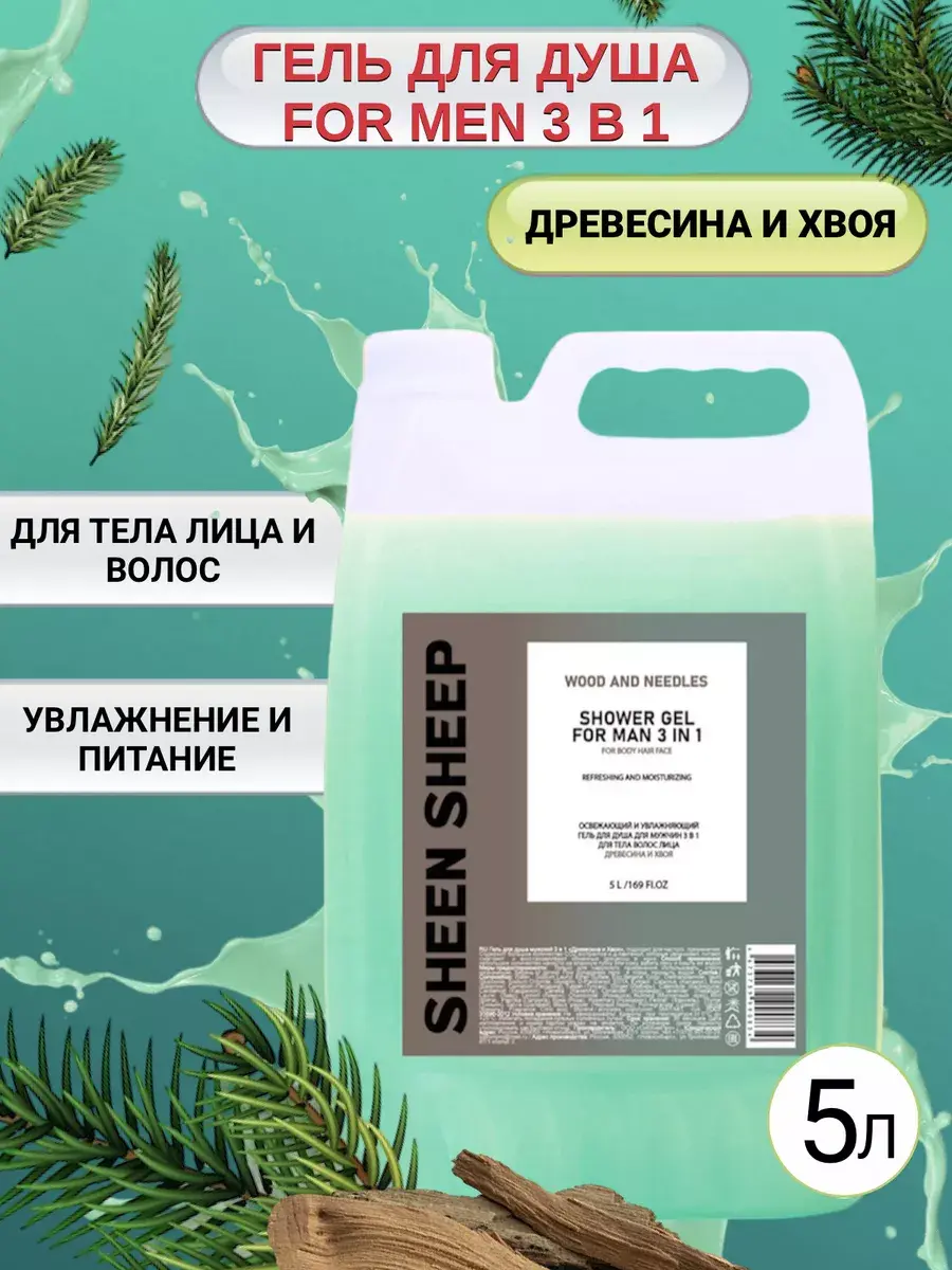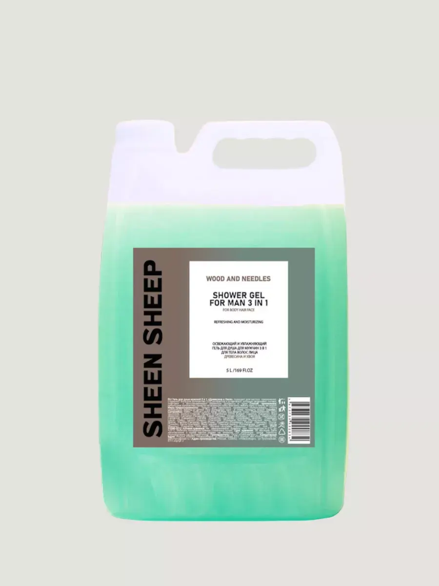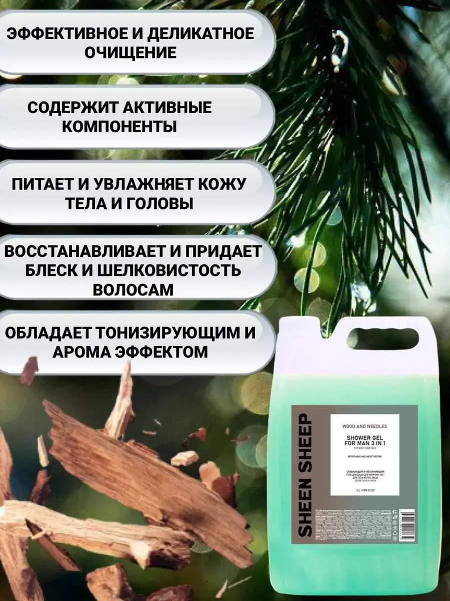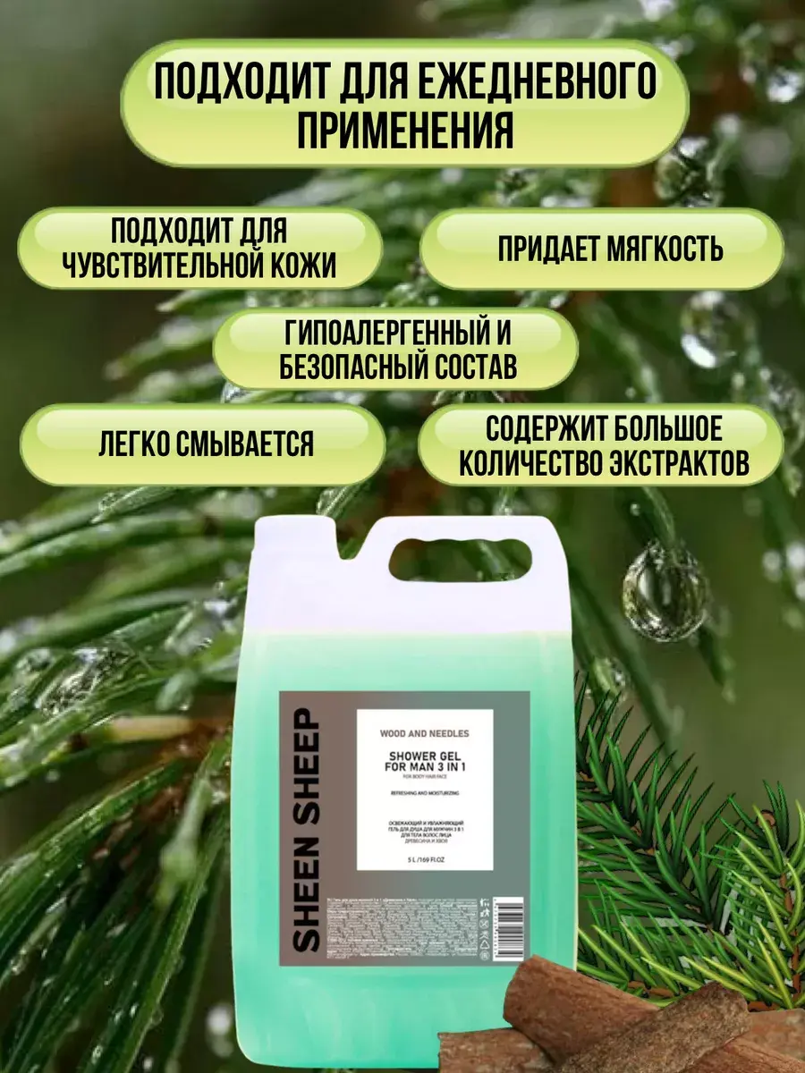 Мужской парфюмированный гель для душа и шампунь 3в1 Древесина и Хвоя из коллекции бренда SHEEN SHEEP 5л - гипоаллергенное увлажняющее средство для очищения и ухода за кожей тела, лица, головы. Уникальный состав гель шампуня бережно очищают кожу, не пересушивая ее, не вызывает перхоти. Активные компоненты делают волосы более гладкими послушными, снимают раздражение, дарят невероятную мягкость и гладкость. Этот роскошный мужской аромат, который может подойти и для женщин, расслабляет, приносит удовольствия от принятия ванны и душа после тяжелого рабочего дня или тренировки. Мягкая формула обладает тонизирующим действием, легко распределяется по всему телу, образуя обильную пену, которая нежно очищает, удаляя загрязнения. Гель для душа шампунь для волос 3в1 можно применять для всех типов кожи. Консистенция его очень густая, что уменьшает расход. СПОСОБ ПРИМЕНЕНИЯ: нанести средство на ладонь или мочалку, предварительно смочив водой, и распределите массирующими движениями по волосам или телу до образования пены, затем смойте. Идеально для ежедневного мытья в душевой кабине или ванной, наслаждайтесь его приятным парфюмированным ароматом на основе качественной отдушки. Большая канистра объемом 5 литров, это отличный вариант, который поможет сэкономить ваш бюджет и время, позволяет использовать в гостиницах, отелях, спортзалах, в бане, парикмахерских.